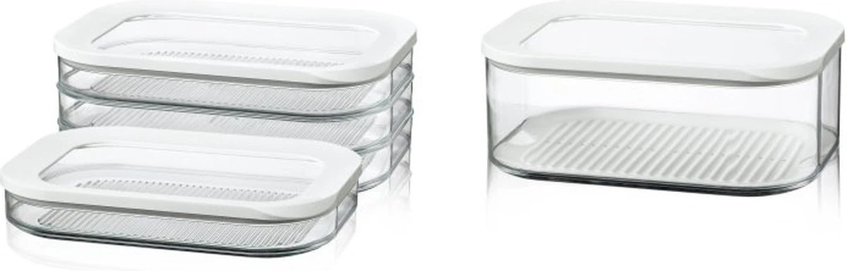 Vleeswarendoos Modula 3-delig, voorzien van een doorzichtige deksel met witte ring. De rechthoekige Modula vleeswarendoos met afgeronde hoeken heeft een inhoud van 1650 ml en geeft direct zicht op inhoud, ook in de koelkast! De witte afdichtring van de bewaardoos zorgt voor een perfecte afsluiting, waardoor deze koelkastdoos geschikt is voor het bewaren van diverse vleeswaren in 3 lagen. De Modula bewaar- en opbergdozen van Mepal zijn verkrijgbaar in verschillende maten en uitvoeringen, liggen goed in de hand en zijn makkelijk te openen. Bovendien zijn ze stapelbaar en vaatwasmachinebestendig. Hoe veeleisend u ook bent: Modula bewaardozen zijn erop berekend!